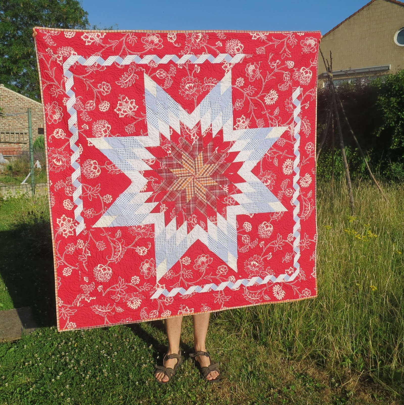 advent calendar I made last year. I actually pieced it in January this year, because we needed a small pieced project to practice machine quilting on a course I took in March. It was quilted in March, and then lay waiting to be finished until last week. I had even cut the backing fabric and the binding, so it was an easy project to pick up and finish last Friday morning, when I had a free morning, happily spent machine quilting Lucas' sheep quilt and finishing the machine sewing on this pillow case. I finished hand sewing the binding yesterday morning. I' m very pleased with how it turned out.